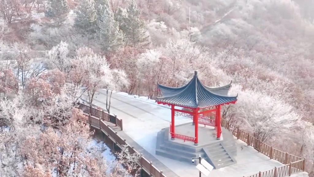 山峰、樹木都被冰雪點(diǎn)綴,粉妝玉砌,銀光閃爍。晶瑩剔透的霧凇與蜿蜒的山路交相輝映,構(gòu)成了一幅壯觀的冬雪美麗畫卷。