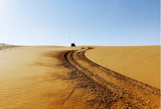 4月8日,一輛越野車正在庫布其沙漠穿沙。