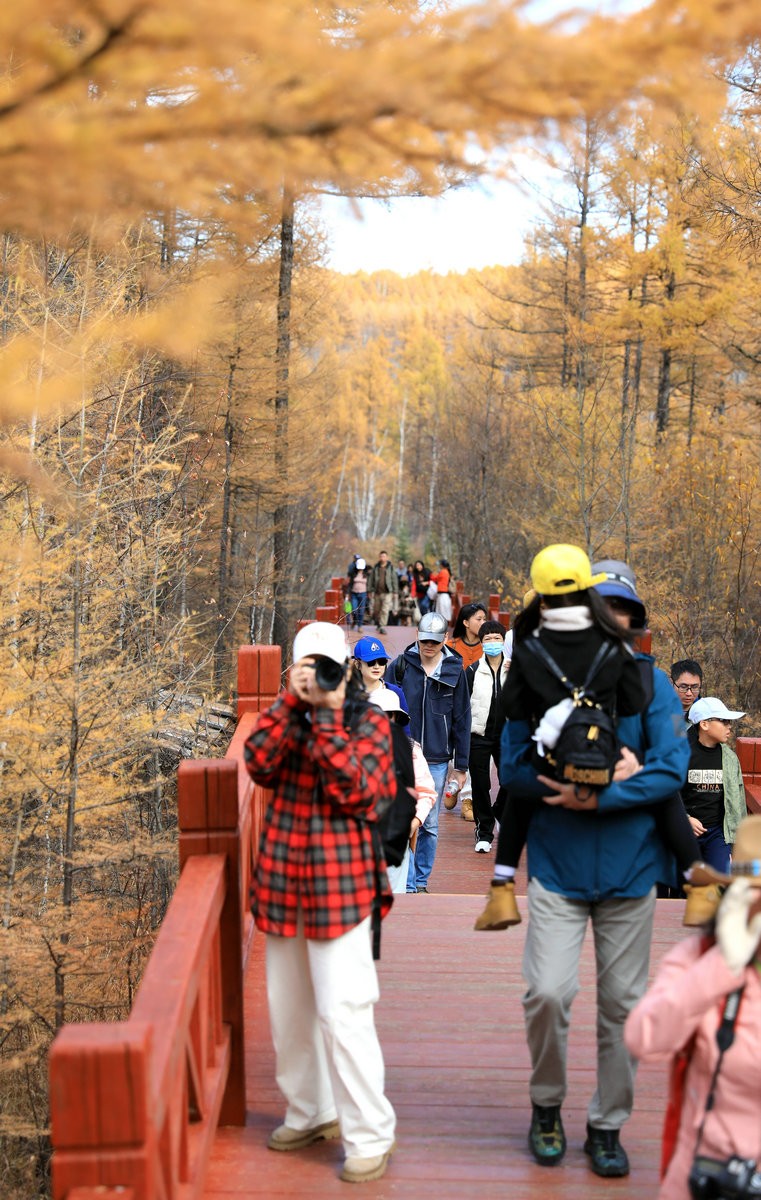 9月29日,游客在內(nèi)蒙古阿爾山國(guó)家森林公園三潭峽欣賞秋色 北疆新聞?dòng)浾?張楊攝影