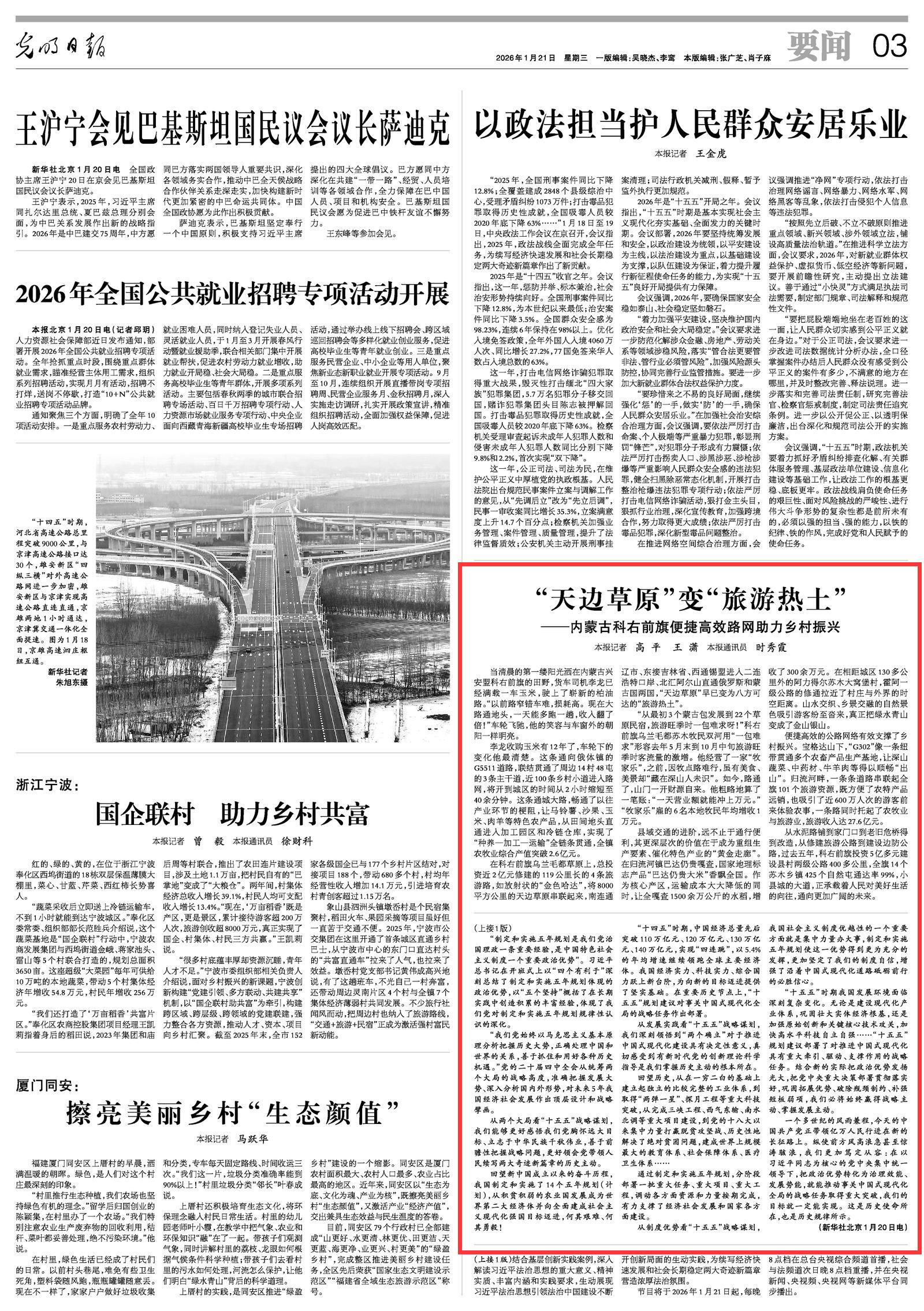 2026年1月21日《光明日?qǐng)?bào)》第3版刊發(fā)了《“天邊草原”變“旅游熱土”——內(nèi)蒙古科右前旗便捷高效路網(wǎng)助力鄉(xiāng)村振興》的文章,報(bào)道了過(guò)去五年,科右前旗投資5億多元建設(shè)縣村兩級(jí)公路400多公里,全旗14個(gè)蘇木鄉(xiāng)鎮(zhèn)425個(gè)自然屯通達(dá)率99%,小縣城的大道,正承載著人民對(duì)美好生活的向往,通向更加廣闊的未來(lái)。