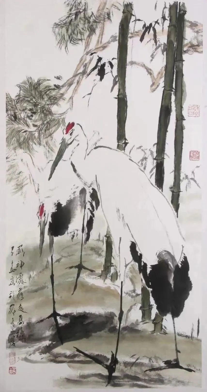 仙鶴是王子武鐘愛的動(dòng)物題材?!讹L(fēng)神灑落占高秋》是王子武晚年畫仙鶴喜歡使用的畫作名稱。“羽翼光明欺積雪,風(fēng)神灑落占高秋?!背鲎蕴拼嵐鹊脑姟耳Q》,形容仙鶴高潔,寄托了詩人高逸瀟灑的情懷。