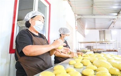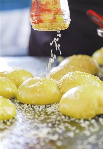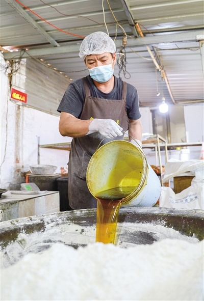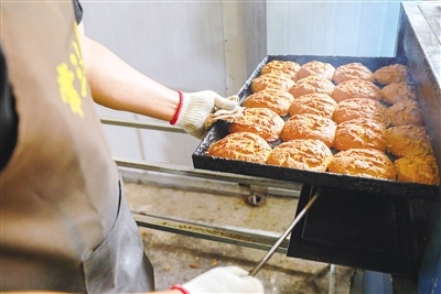 “我們堅持手工制作,就是想留住這個味道!”常三文是隆盛莊月餅制作技藝非遺傳承人,他帶記者來到了打月餅的作坊。一個約60平方米的房間里有兩個大鐵鍋,一個鐵鍋里熬著糖水,另一個鐵鍋用來和面。一名男工將面粉、熟胡麻油、糖水等按比例倒入鐵鍋,然后用鐵鏟攪拌起來。鐵鍋旁邊是一個做月餅的大案板,4個女工稱重、分劑、做胚、擺放,各自忙活著。常三文的兒子常曉峰負(fù)責(zé)將擺放好的月餅放進燒爐火的烤爐,計時、下簽子、刷油……直至月餅烤制完成出爐。