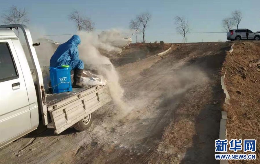 3月21日,達(dá)拉特旗疫控人員對(duì)黃河國堤內(nèi)死豬打撈地進(jìn)行消毒。新華社發(fā)