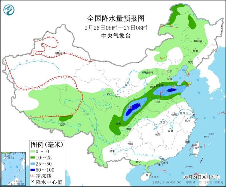 中新網(wǎng)9月24日電 據(jù)中央氣象臺(tái)網(wǎng)站消息,24日至26日,西北地區(qū)東南部、四川盆地中北部、華北中南部、黃淮等地有較強(qiáng)降水過程。甘肅東南部、陜西中南部、華北南部、山東中南部、河南北部等地部分地區(qū)有暴雨,局地大暴雨。