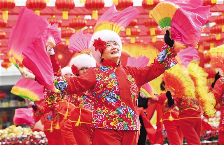 2月14日,演員們?cè)趦?nèi)蒙古展覽館廣場(chǎng)上跳起歡快的舞蹈。當(dāng)日,內(nèi)蒙古展覽館開(kāi)展“傳統(tǒng)文化月月傳”邀您一起鬧元宵活動(dòng)。記者 王磊 攝