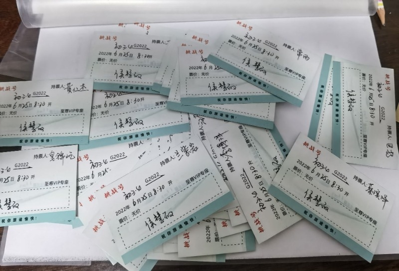 6月20日,呼和浩特市第五中學(xué)初三(4)班班主任侯慧敏老師給班里57名學(xué)生的手寫“告別信”刷屏朋友圈,紙短情長(zhǎng),愛意滿滿。每封信箋做成車票的樣式,正面寫著車次:“挑戰(zhàn)號(hào)”G2022;時(shí)間:2022年6月25日8時(shí)30分;座位:至尊VIP專座;票價(jià):無(wú)價(jià)?!敖K點(diǎn)站”并未填寫。侯慧敏說(shuō),那是孩子們的夢(mèng)想,需要靠他們自己來(lái)完成。當(dāng)天的畢業(yè)班會(huì)上,當(dāng)每個(gè)學(xué)生打開信箋,滿滿的回憶和濃濃的情誼不禁讓孩子們潸然淚下。