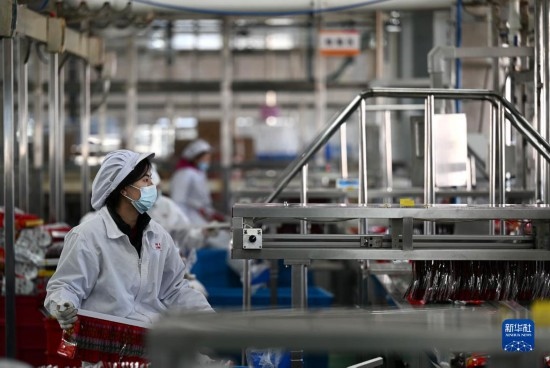 在天津市利民調(diào)料有限公司辣醬灌裝生產(chǎn)線,工作人員在檢查產(chǎn)品包裝(2月20日攝)。