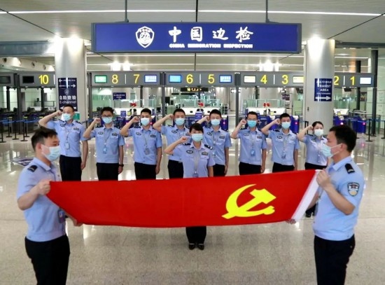 圖為孫偉帶領(lǐng)執(zhí)勤隊黨員移民管理警察開展重溫入黨誓詞活動。