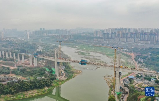 3月18日在四川省瀘州市拍攝的渝昆高鐵瀘州沱江特大橋主跨合龍施工現(xiàn)場(無人機照片)。