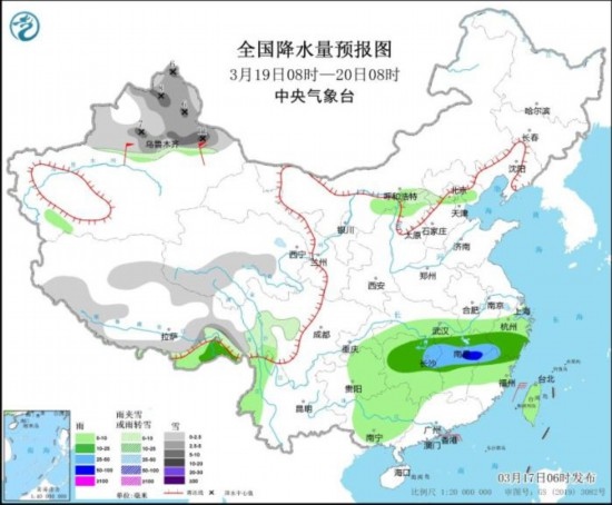 3月19日08時(shí)至20日08時(shí),新疆北疆大部和沿天山地區(qū)、西藏北部和南部、青海南部等地部分地區(qū)有小到中雪或雨夾雪,其中,新疆沿天山地區(qū)和東部等地部分地區(qū)有大到暴雪(10~11毫米)。西藏東南部、湖南中北部、江西中北部、浙江南部、福建北部等地部分地區(qū)有中到大雨,其中,江西中部、福建西北部等地局地有暴雨。新疆南疆盆地和東部等地部分地區(qū)有7~9級風(fēng)。