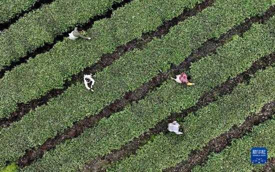 3月21日,在湖南省永州市江華瑤族自治縣橋市鄉(xiāng)大魚塘村,茶農(nóng)在茶園采茶(無人機照片)。