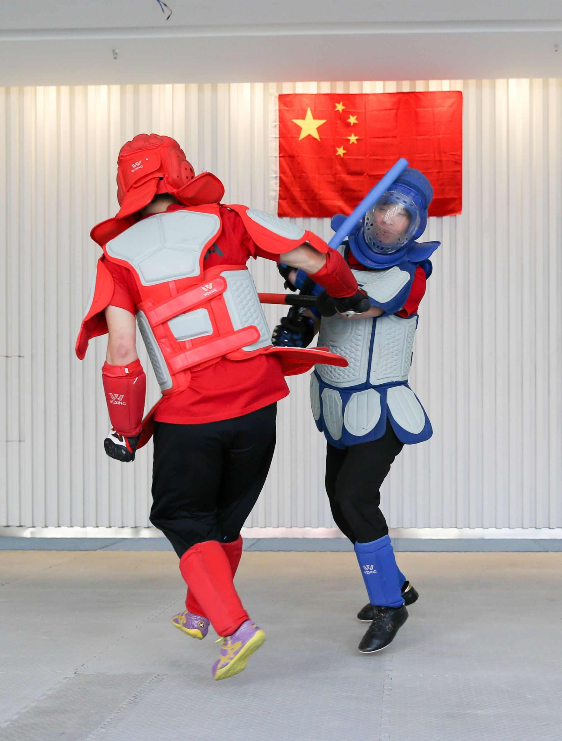 “武術(shù)兵道以手持短兵器為攻防之道,融武術(shù)套路演練與競技對抗為一體。與劍道和擊劍不同,武術(shù)兵道的進(jìn)攻方要巧妙使用劈、砍、斬、刺等招數(shù)的組合,連續(xù)攻擊對手身體;防守一方要用架、格、卸等招數(shù)避免被對手擊中頭部、軀干、小腿等得分區(qū)域?!眱?nèi)蒙古武術(shù)兵道隊(duì)教練張宇說。