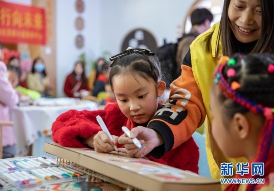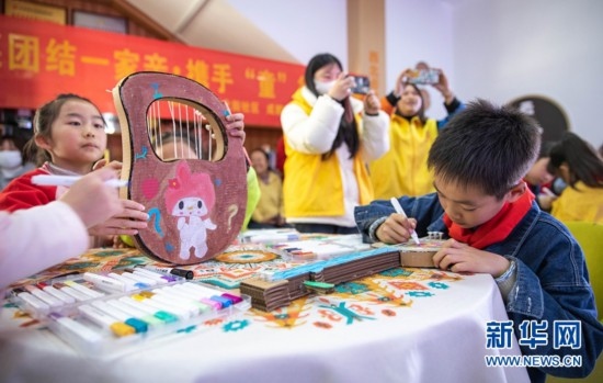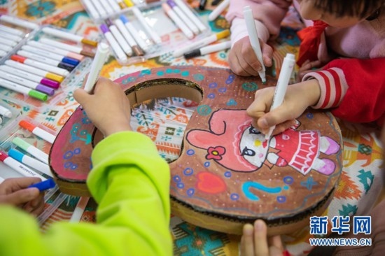 在成都市金牛區(qū)西北街社區(qū)的服務(wù)大廳一角,一群孩子正為紙板制作的各族樂(lè)器繪畫著色。