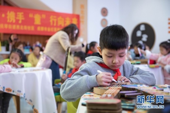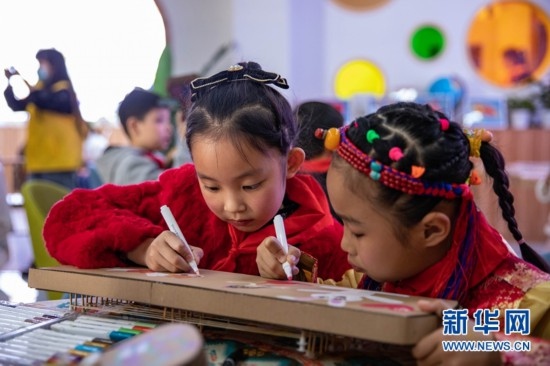 8歲的土旦卡卓是來(lái)自青海玉樹藏族自治州的藏族小朋友,她在為手中紙質(zhì)瑤琴涂畫的同時(shí)也學(xué)習(xí)著其他民族的文化風(fēng)俗。