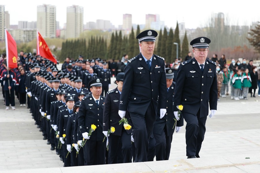上午10時(shí),60名干部民警整齊列隊(duì),警容嚴(yán)整,脫帽肅立,向?yàn)槿嗣窆彩聵I(yè)英勇獻(xiàn)身的英烈默哀,緬懷他們的豐功偉績(jī),寄托對(duì)革命先烈的無(wú)限哀思。伴著肅穆的《獻(xiàn)花曲》,民警們依次瞻仰紀(jì)念碑并敬獻(xiàn)鮮花。隨后,全體民警面向黨旗和烈士紀(jì)念碑,高舉右拳,以錚錚誓言筑牢理想信念,以拳拳初心踐行為民宗旨。(王鵬)