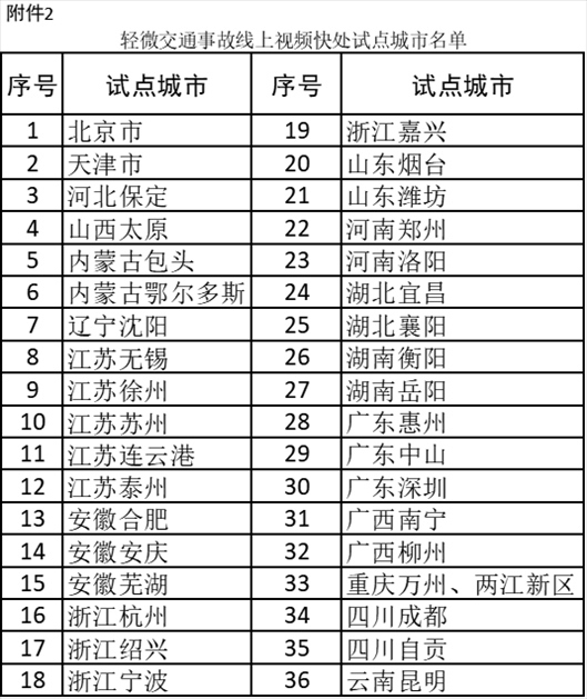 2、輕微交通事故線上視頻快處試點城市名單