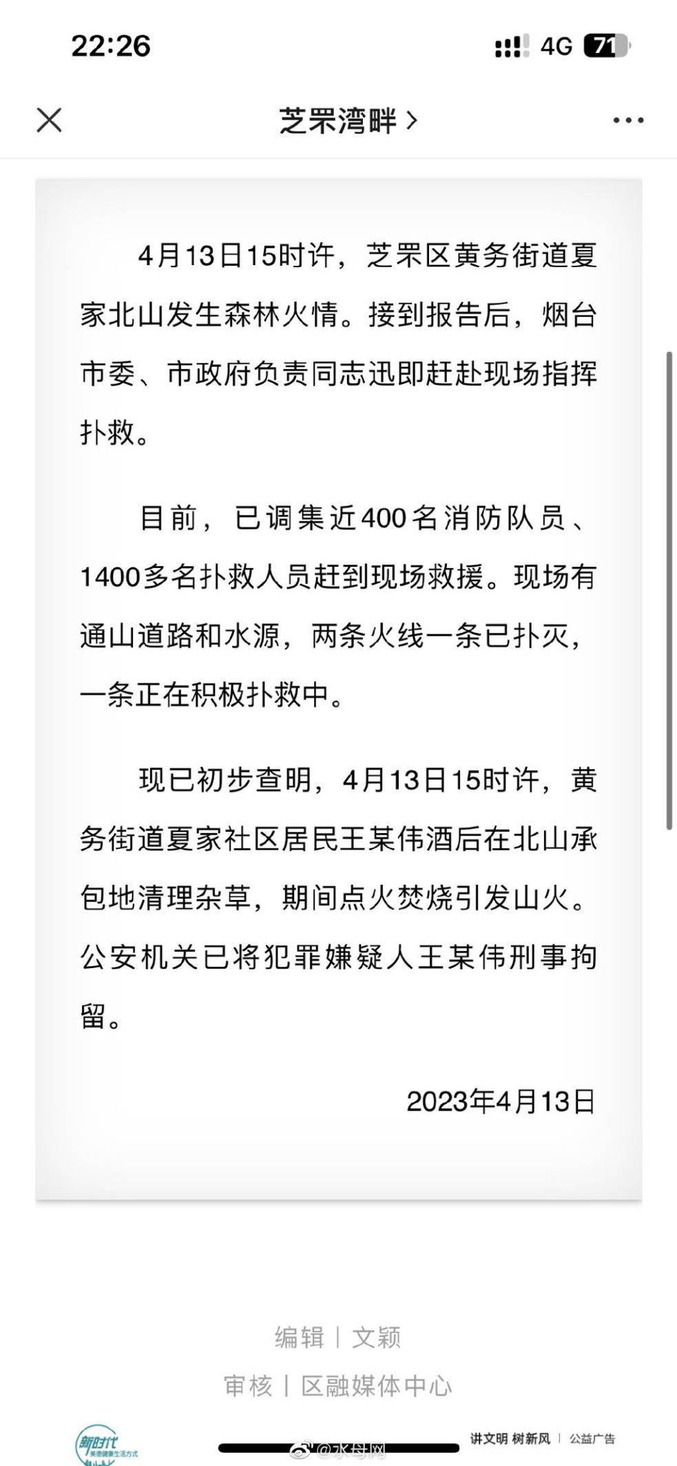 ·官方通報(bào)煙臺山火:系居民焚燒雜草引發(fā),犯罪嫌疑人已被刑事拘留。