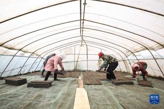 4月14日,盤(pán)錦市盤(pán)山縣的農(nóng)戶(hù)在進(jìn)行水稻秧苗育苗工作。