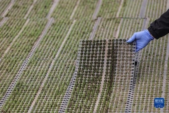 4月14日,盤(pán)錦市盤(pán)山縣的農(nóng)戶(hù)在查看水稻秧苗的育苗情況。