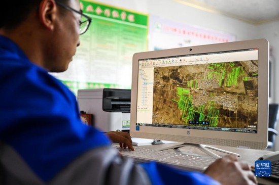 4月12日,在通遼市科爾沁左翼中旗腰林毛都鎮(zhèn),一家農(nóng)業(yè)合作社的負(fù)責(zé)人查看今年耕種的衛(wèi)星地圖。
