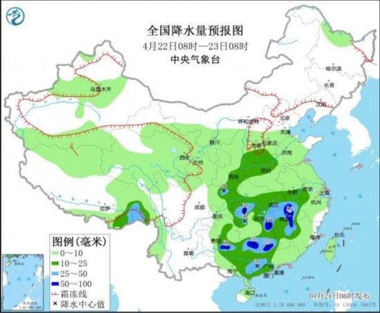 全國降水量預(yù)報圖(4月22日08時-23日08時)