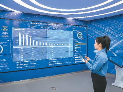 2月24日,在山東省東營經(jīng)濟(jì)技術(shù)開發(fā)區(qū)的東營工業(yè)互聯(lián)網(wǎng)創(chuàng)新中心,碳排放管理員通過碳達(dá)峰大數(shù)據(jù)平臺(tái),查看和展示開發(fā)區(qū)企業(yè)實(shí)時(shí)耗能情況。周廣學(xué)攝(人民視覺)