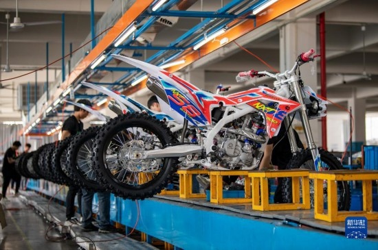 5月4日,在浙江省金華市武義縣桐琴鎮(zhèn)五金工業(yè)區(qū)的一家企業(yè),工人趕制準備銷往海外的越野摩托車。