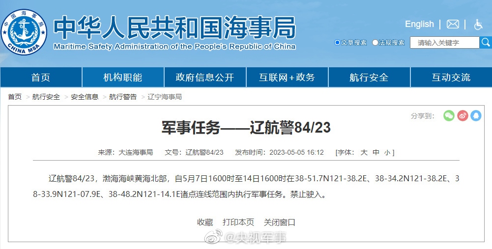 ·連續(xù)7天!渤海海峽黃海北部執(zhí)行軍事任務(wù),禁止駛?cè)搿?/p>