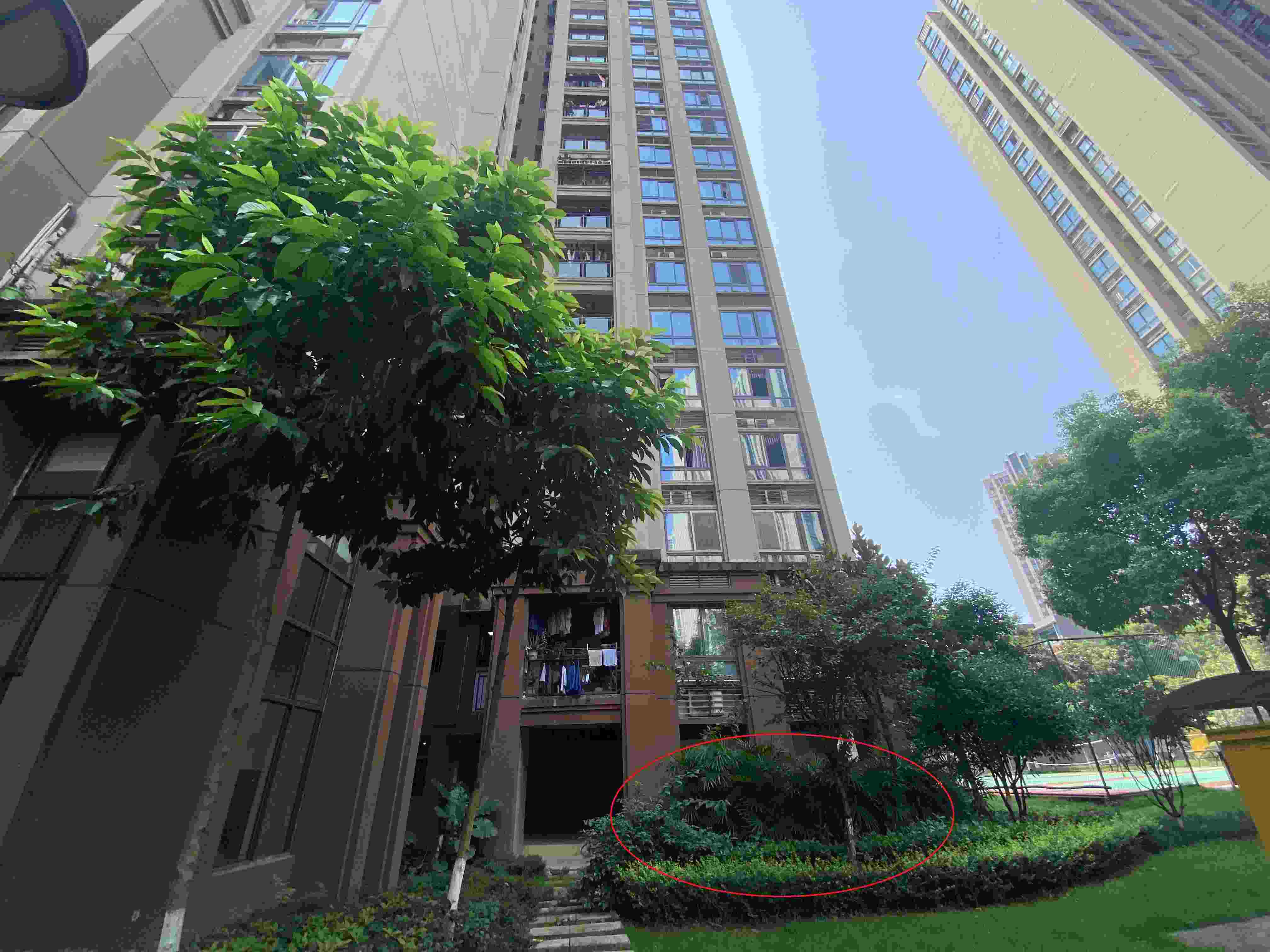 2020年11月2日,2名幼童從重慶南岸區(qū)錦江華府4棟15樓墜下(紅圈處),檢方指控孩子父親涉嫌故意殺人。 澎湃新聞記者 謝寅宗 資料圖
