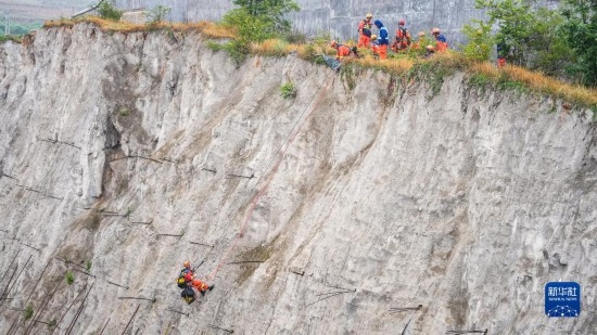 六盤水消防救援支隊隊員在進行模擬高山峽谷救援演練(5月11日攝,無人機照片)。