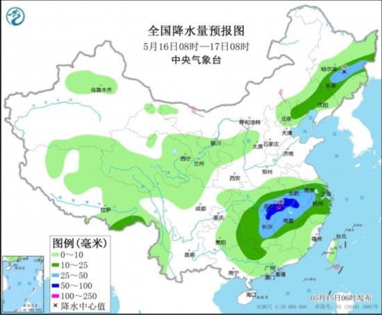 全國降水量預報圖(5月15日08時-16日08時)。圖片來源:中央氣象臺網(wǎng)站