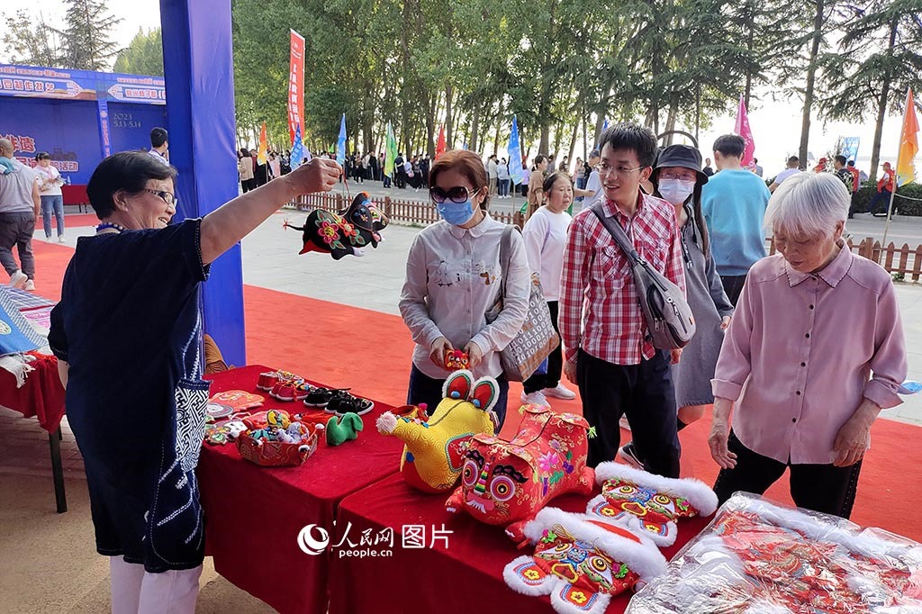 5月14日,“中國旅游日”主題周活動期間,河南省三門峽市陜州區(qū)在黃河岸邊舉辦“傳承多彩非遺”魅力陜州非物質(zhì)文化遺產(chǎn)展演體驗活動,大展傳統(tǒng)藝術魅力,為群眾獻上了一場“非遺文化盛宴”。在活動現(xiàn)場,當?shù)厥〖壏沁z傳承人向游客展示文創(chuàng)產(chǎn)品布老虎。人民網(wǎng)記者 王玉興攝