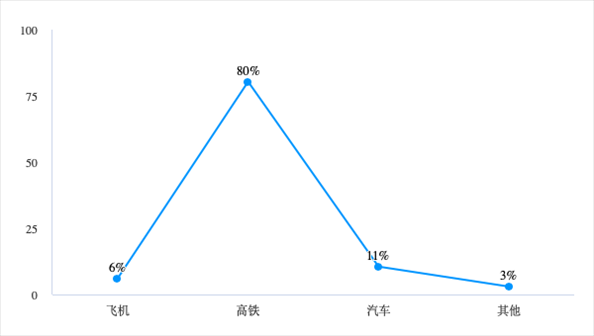 正因大部分受訪者選擇的都是周邊短途游,所以高鐵成為了最為便捷和價格適宜的交通工具,有80%的受訪者選擇的出行工具是高鐵。