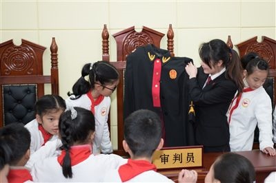 安源區(qū)法院“法之光”保護(hù)未成年人工作室的法官向?qū)W生講解法袍法徽知識(shí)。