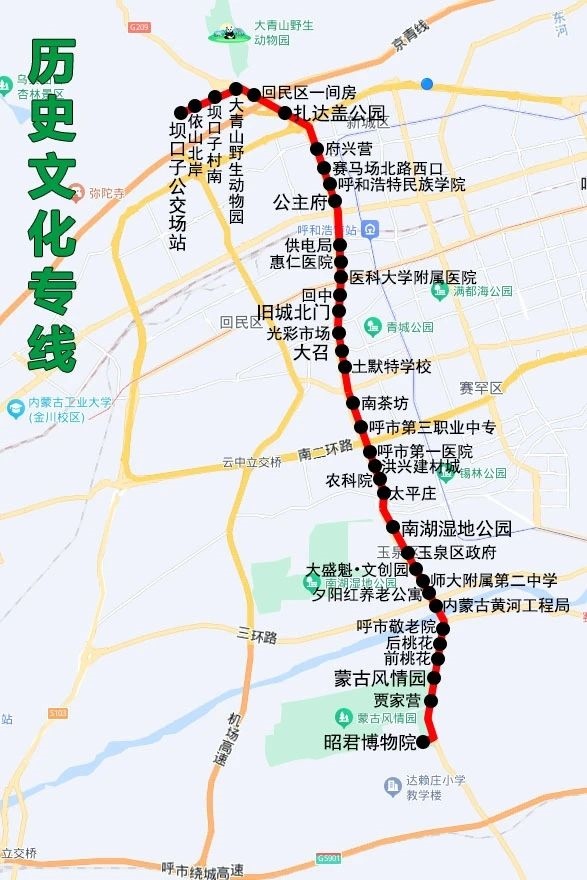 沿途設(shè)站:壩口子公交場站、依山北岸、壩口子村南、大青山野生動物園、回民區(qū)一間房、扎達(dá)蓋公園、府興營、賽馬場北路西口、呼和浩特民族學(xué)院、公主府、供電局、匯仁醫(yī)院、醫(yī)科大學(xué)附屬醫(yī)院、回中、舊城北門、光彩市場、大召、土默特學(xué)校、南茶坊、呼市第三職業(yè)中學(xué)、呼市第一醫(yī)院、洪興建材城、農(nóng)科院、太平莊、南湖濕地公園、玉泉區(qū)政府、大盛魁文創(chuàng)園、師大附屬第二中學(xué)、夕陽紅養(yǎng)老公寓、內(nèi)蒙古黃河工程局、呼市敬老院、后桃花、前桃花、蒙古風(fēng)情園、賈家營、昭君博物院。