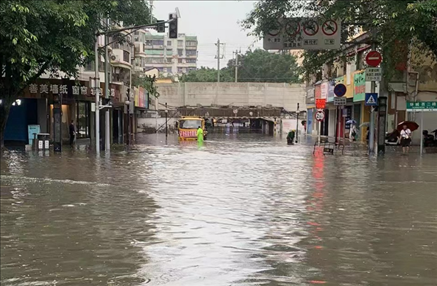 暴雨過(guò)后,城市道路積水嚴(yán)重,城區(qū)出現(xiàn)內(nèi)澇,市民蹚水出行。