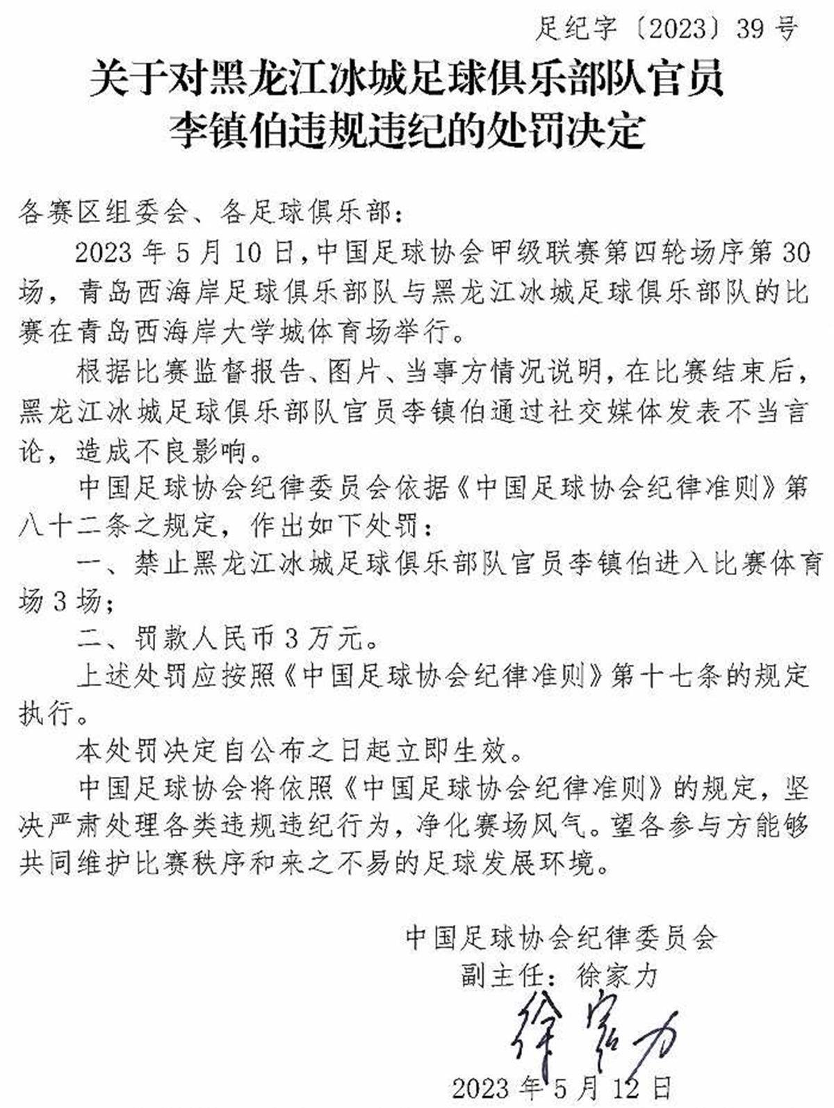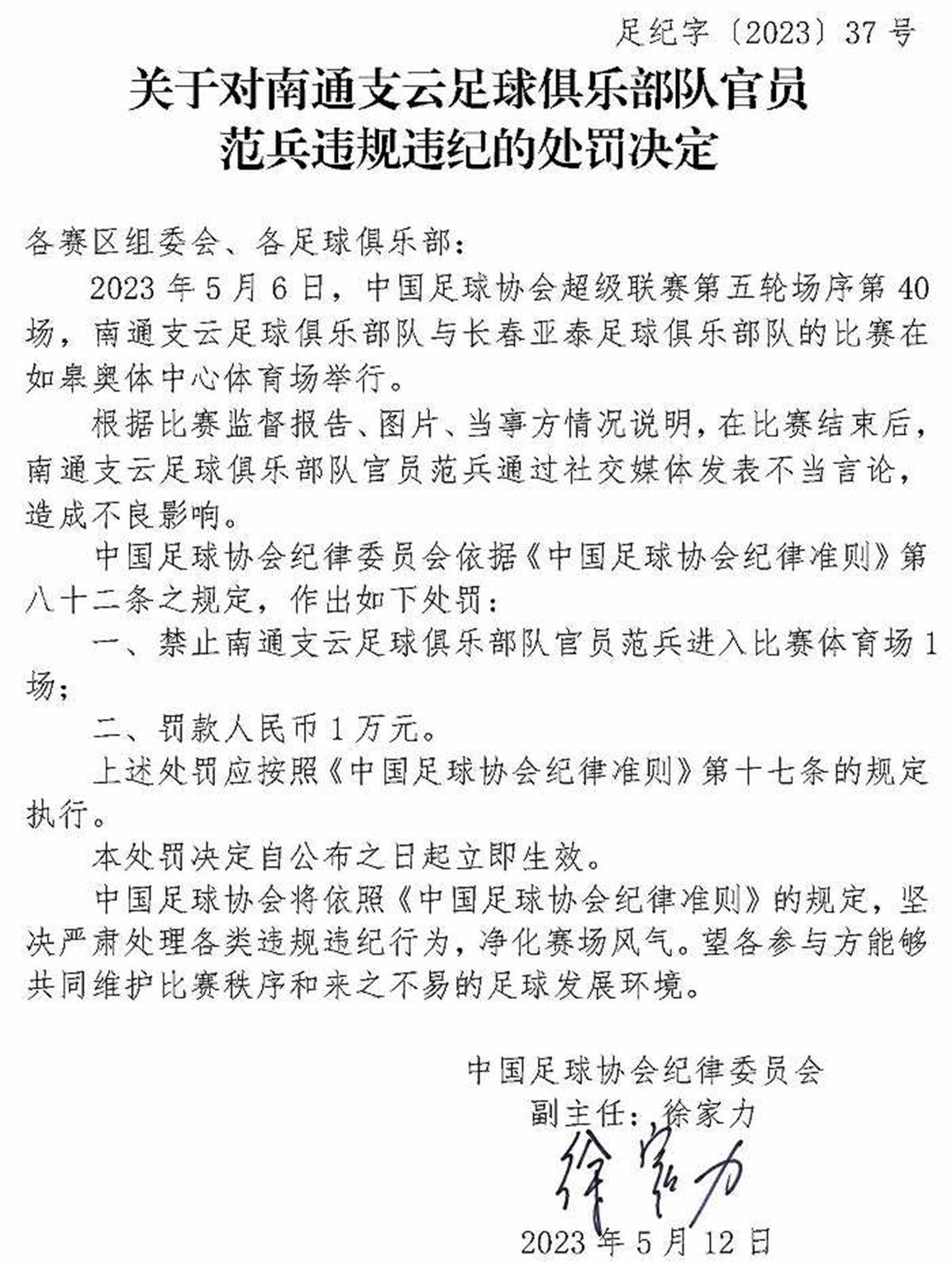 中國足協(xié)紀(jì)律委員會根據(jù)裁判員報(bào)告、比賽監(jiān)督報(bào)告、視頻、當(dāng)事方情況說明及聽證,認(rèn)定楊帆實(shí)施暴力行為,于是依據(jù)《中國足球協(xié)會紀(jì)律準(zhǔn)則》第五十三條、第四十八條之規(guī)定,對他給予停賽4場、罰款人民幣4萬元的處罰。在這張罰單上,第一次出現(xiàn)了徐家力的名字。從這張罰單來看,中國足協(xié)紀(jì)律委員會定下了基調(diào),那就是嚴(yán)厲打擊球場暴力行為。