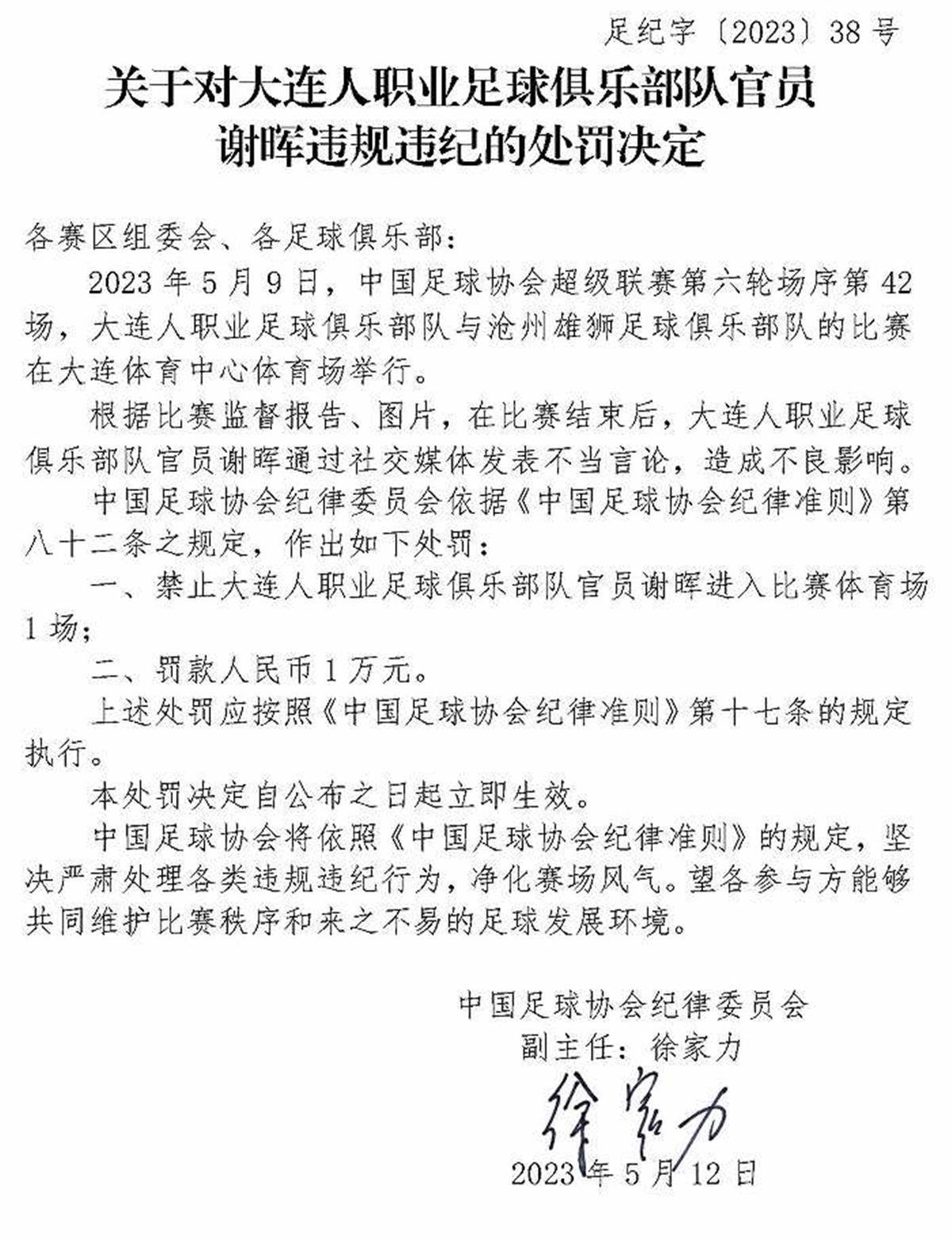 5月12日,中國足協(xié)紀(jì)律委員會接連開出三張罰單,對中超大連人隊(duì)的主教練謝暉,以及南通支云隊(duì)、黑龍江冰城隊(duì)的兩位俱樂部官員范兵和李鎮(zhèn)伯進(jìn)行了處罰,共計(jì)罰款5萬元,并對三人追加禁賽。這三張罰單一出,引來外界的一片質(zhì)疑聲。