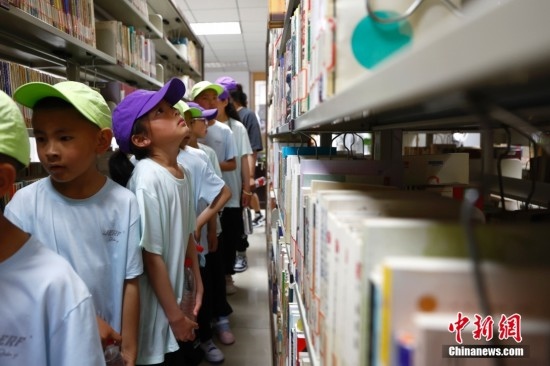 圖為一個(gè)藏族女孩抬頭望向書架。富田攝