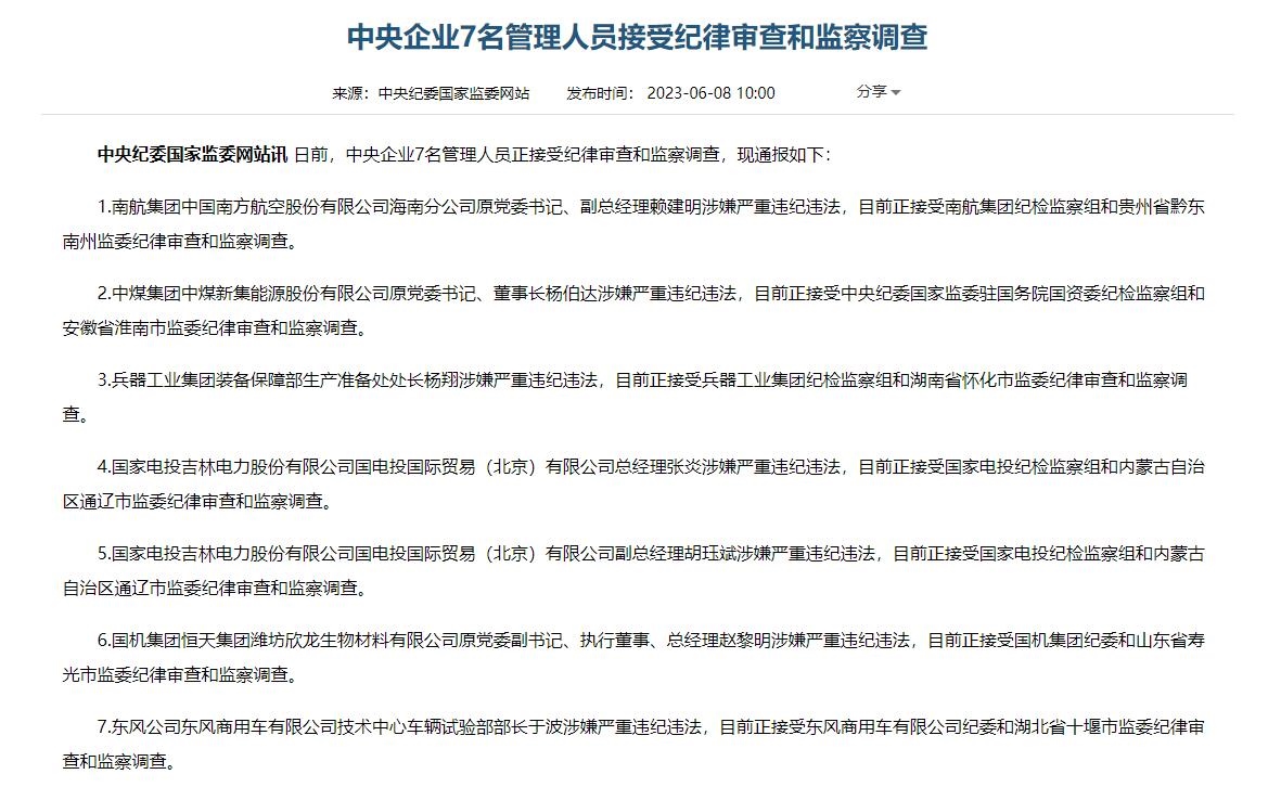 ·中央企業(yè)7名管理人員接受紀(jì)律審查和監(jiān)察調(diào)查。