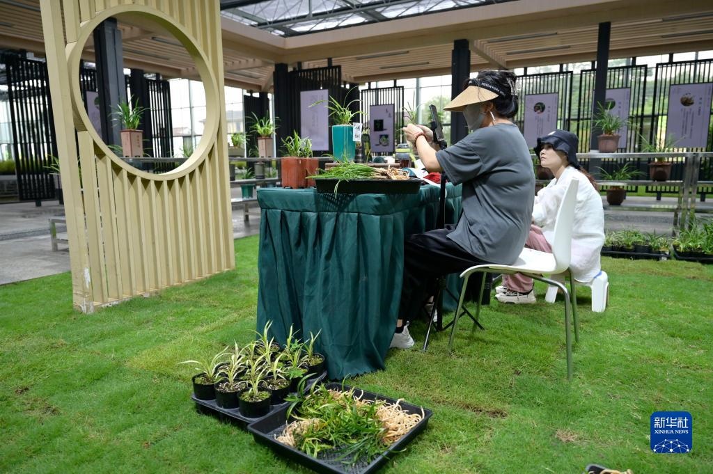 6月8日,在浙江省紹興市柯橋區(qū)漓渚鎮(zhèn)棠棣村的蘭花數(shù)字工廠,一位游客觀看花卉。新華社記者 才揚 攝
