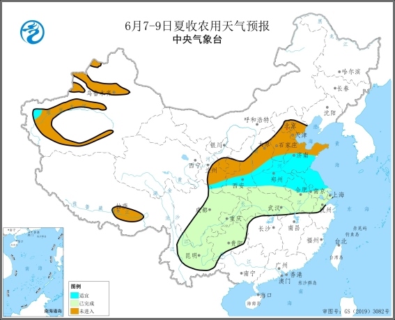 預(yù)計(jì)6月7-9日,夏收區(qū)大部多晴好天氣,利于搶晴收曬已成熟冬小麥和加快夏收進(jìn)度;河南、陜西等地前期降水偏多地區(qū)的低洼麥田漬澇將減輕,為麥?zhǔn)諜C(jī)械化作業(yè)逐步創(chuàng)造條件。未來3天,河北中東部和南部、河南北部、山西東南部、山東西部、安徽東部等地的局部地區(qū)將有雷暴大風(fēng)或冰雹等強(qiáng)對流天氣,冬小麥點(diǎn)片倒伏風(fēng)險(xiǎn)較高,對未成熟小麥籽粒充分灌漿不利,并將增加已成熟小麥機(jī)收難度。7-14日華北、黃淮、新疆等地部分地區(qū)將有35℃以上高溫天氣,局地日最高氣溫在37℃以上,上述地區(qū)堆積的濕麥發(fā)熱霉變的風(fēng)險(xiǎn)較高,新疆冬小麥遭受干熱風(fēng)災(zāi)害的風(fēng)險(xiǎn)也較高。
