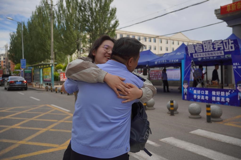 6月9日,在遼寧省阜新市海州高級(jí)中學(xué)考點(diǎn),考生邢雨桐與身為考點(diǎn)執(zhí)勤民警的父親熱情相擁。新華社記者王瑩 攝