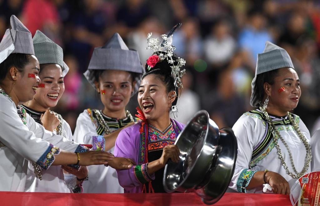 6月9日,少數(shù)民族村民為球隊(duì)助威。新華社記者 楊文斌 攝
