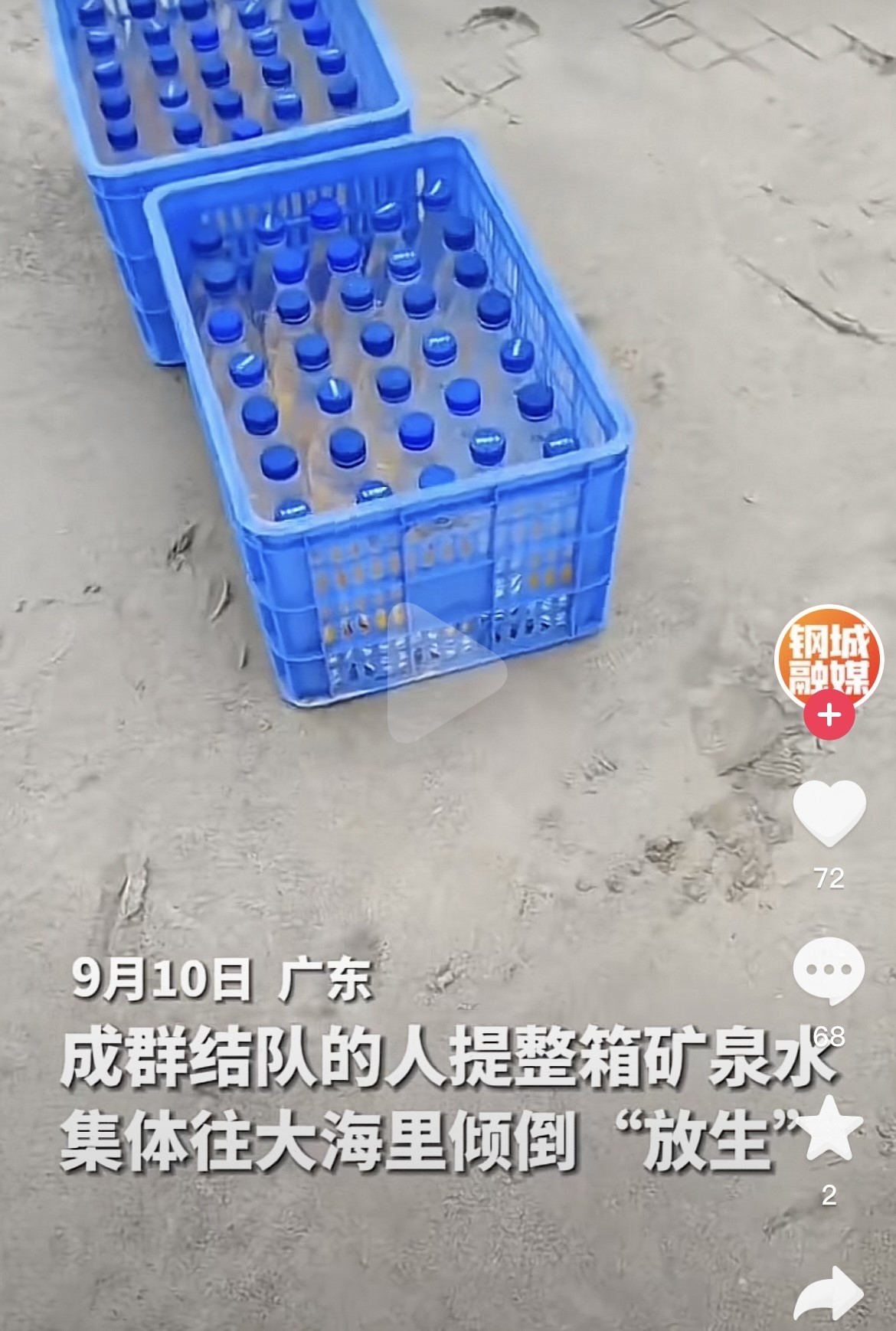 近日,有網(wǎng)友在社交平臺(tái)發(fā)布稱,廣東汕尾湖東港有一群人往海里“放生”礦泉水,60多箱礦泉水被浪費(fèi)。現(xiàn)場(chǎng)視頻顯示,一群人抬著藍(lán)色的箱子正往海邊走,箱子里可見擺放整齊的礦泉水瓶。視頻發(fā)布者介紹,9月10日下午3點(diǎn)多來了兩輛大巴,大巴上坐滿了人。