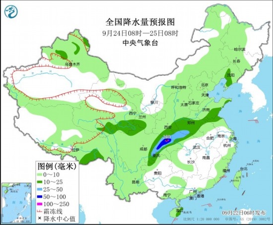 全國降水量預報圖(9月22日08時-23日08時)。圖片來源:中央氣象臺網(wǎng)站
