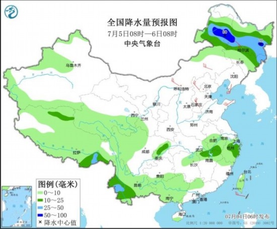 全國(guó)降水量預(yù)報(bào)圖(7月5日08時(shí)-6日08時(shí))。圖片來源:中央氣象臺(tái)網(wǎng)站
