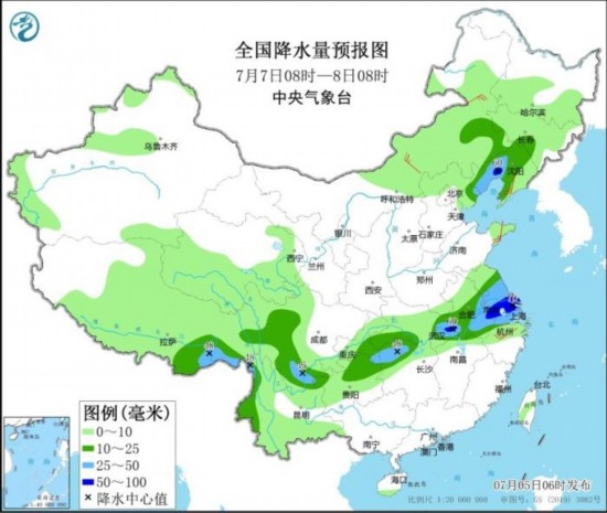 全國(guó)降水量預(yù)報(bào)圖(7月7日08時(shí)-8日08時(shí))。圖片來(lái)源:中央氣象臺(tái)網(wǎng)站