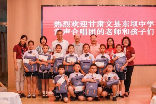 7月4日中午,在中國(guó)記協(xié)會(huì)客廳,文縣東壩童聲合唱團(tuán)的孩子們見(jiàn)到了他們熟悉的中國(guó)記協(xié)黨組書(shū)記、副主席劉思揚(yáng)爺爺。今年2月,劉思揚(yáng)爺爺專(zhuān)門(mén)來(lái)到文縣,走進(jìn)他們的排練廳,聆聽(tīng)了他們即將在甘肅廣播電視總臺(tái)演出的曲目。他當(dāng)場(chǎng)說(shuō):“我被孩子們眼中的光深深地觸動(dòng)了。這是一種自信的、堅(jiān)毅的光。帶著這種光,無(wú)論你們將來(lái)走出大山,還是學(xué)成后回到山里建設(shè)家鄉(xiāng),這種自信和堅(jiān)毅的情愫都將伴隨你們終生。”今天孩子們都成了劉思揚(yáng)爺爺?shù)男】腿?。劉爺爺給孩子們講述了什么是記者、什么是記協(xié),鼓勵(lì)孩子們好好學(xué)習(xí),將來(lái)報(bào)效祖國(guó)。劉爺爺還為每個(gè)孩子準(zhǔn)備了滿(mǎn)滿(mǎn)一個(gè)大書(shū)包的各種禮物。孩子們排著演出隊(duì)形,為中國(guó)記協(xié)的老師們唱出了《大山里的孩子》,還有那首剛剛學(xué)會(huì)的、走進(jìn)央視錄音棚的《童心里的中國(guó)》: