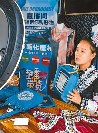 在貴州省新仁苗族鄉(xiāng)化屋村的文創(chuàng)產(chǎn)品直播間,繡娘推介苗繡文創(chuàng)產(chǎn)品。